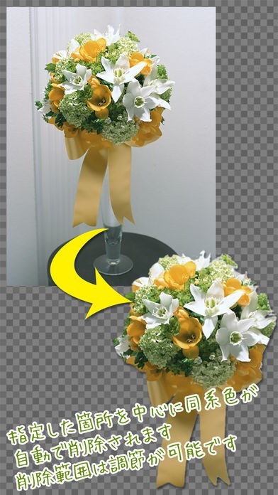 不要部分を削除して写真を綺麗に仕上げたい!そんな時にはこちらの「背景透過」の各種機能が活躍してくれます。写真の切り抜き機能をメインとして搭載。色を指定して自動切り抜きが行える他、手動でブラシを動かして細かな切り抜きができるのも便利なポイント。人物の髪や花びらの隙間など、複雑な箇所はブラシによる切り抜きによって調整すれば、出来上がりをより美しくすることができるでしょう。写真の拡大縮小機能も用意されており、指先だけで画像を大きく拡大しながら操作が可能。さらに出力機能ではPNG形式もしくはJPEG形式の2つから画像の用途に合わせて選択できるようになっています。