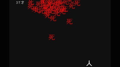 スマートフォンを傾けて、迫りくる死から人を逃がすゲームです。 死とは、死と書かれたフォント文字であり、人も同じです。 じりじりと迫る死の文字はなかなかのハイスピード。死に触れるとゲームオーバーになり、画面には享年が表示されます。 傾け方を間違えたり、もたもたしているとあっという間に終わってしまうため、気が抜けません。 逃げ回るごとに死の文字が増えていき、逃げにくくなります。 背景は黒を基調としたデザインなので、どことなく不気味です。