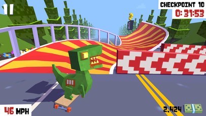 ゲーム内で貯めたお金で解放されるポリゴンのゴリラや怪獣などのキャラクターを操ってスケボーを楽しめる!