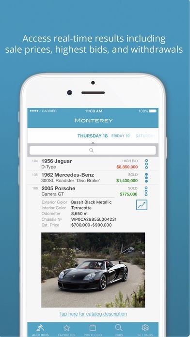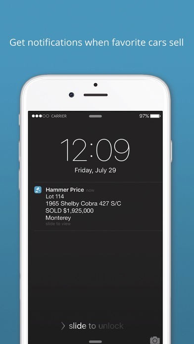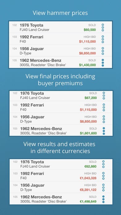 App Storeより引用Hammer Price is the original way to follow all of your favorite collector car auctions at once, in real-time. Preview auction runlists, keep track of interesting lots, compare today’s prices with past results, and see what’s selling now.