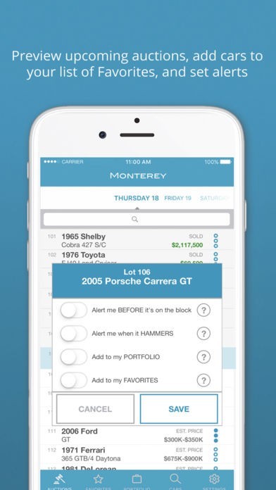 Choose the sales you want to follow and add them to your Auctions list. Interested in seeing how a particular car does? Add it to your Favorites for quick reference. Opt for an alert and you’ll get notified before your car crosses the block or when it hammers.