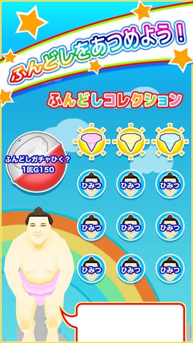 「グルコサミン」は、画面に表示されている力士のひざを回すことでグルコサミンをチャージし、そのグルコサミンの力でジャンプした距離を競うゲームです。グルコサミンをチャージするには、力士の下にあるボタンを左右にこすりまくってください。5秒間でできる限りグルコサミンを貯めたら発射ボタンを押して力士を打ち上げます。飛んだ距離に応じてグールドが手に入り、150グールドごとにガチャを回して新しい色のふんどしや特殊な機能を持ったふんどしをゲットできます。