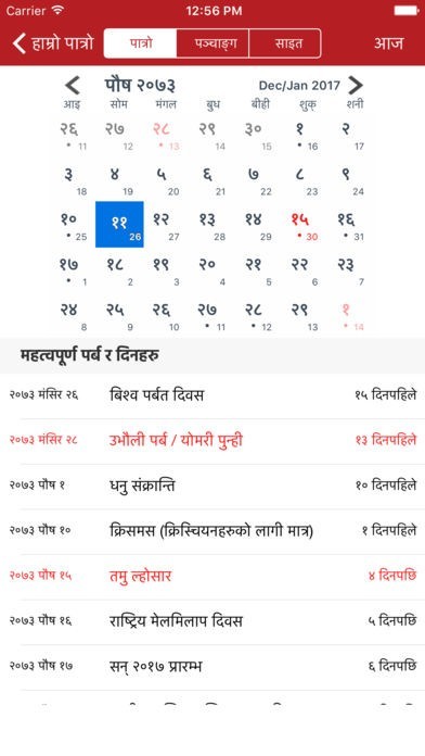 App Storeより引用This app shows current Nepali date/time and Nepali Calendar including public holidays, festivals, and other important events. In addition to calendar feature, this app shows current forex values and its trends in last 30 days. Another important feature is ability to convert nepali date (BS) to Gregorian (Western) calendar (AD) and vice versa.