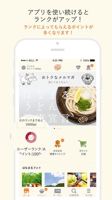 誰もが知ってる有名うどんチェーン店でお得に食べるには…「はなまるうどん 公式アプリ」がオススメです。 本アプリでは、はなまるうどん店の情報が載っているだけでなく、お得なクーポン券を取得することができます。 クーポンをGETするには、ポイントを貯める必要があります。ポイントは、毎日ログインすることや、はなまるチャレンジというミッションをこなすこと等で獲得することができます。 また、アプリを使い続けると、ランクが上がっていきます。このランクが上がるほど、クーポンの内容がよりお得なものへと変わっていきます。
