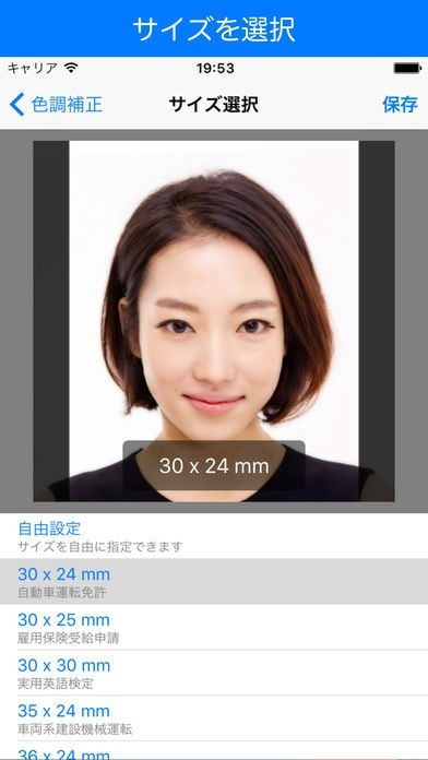 運転免許証や履歴者はもちろん、英語検定や雇用保険受給申請に使用する証明写真用のサイズなど様々な書類に使えるサイズが取り揃えられています。選択項目にサイズが無い場合でも自由にサイズを設定することができます。