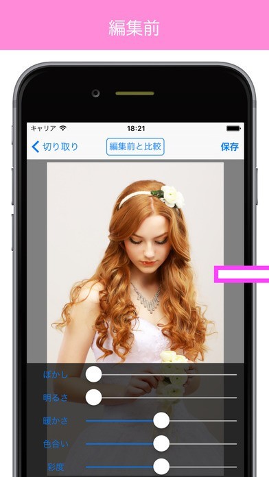 Soft Focusは、自撮りした写真に全体にぼかしや明るさを入れて、ゆるふわを演出します。ぼかしや明るさを加えながら、スライダーで細かく調整できます。美白になれるように、暖かさや色合い、彩度も調節可能です。それぞれ自分で調節していくので、自然な仕上がりになります。透明感が出すとそばかすやシミが目立ちにくくなります。女性が気になる化粧をしていないときにも便利です。サイズ機能は、写真を好きなサイズに指定します。好きな大きさに切り取って、画像サイズを変えていきます。インスタ用など。自撮り写真をきれいに見せたいときにも役立ちます。