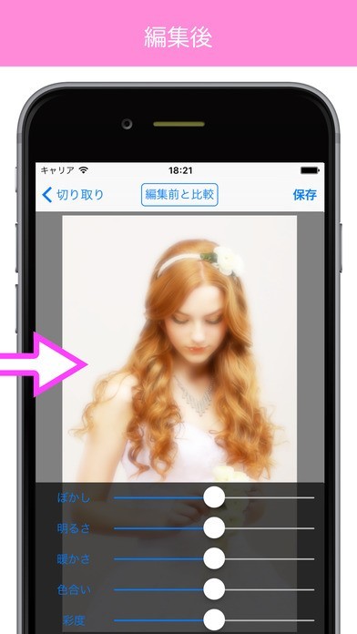 自撮りした写真は、少しぼかしを入れてきれいに見えるようにします。画面を見ながらぼかしや明るさをスライダーで細かく調整していきます。暖かさや色合い、彩度も入れることで肌に透明感が出てきます。化粧をしていなくても、そばかすやシミが目立ちにくくなります。