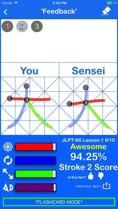 •You are given a overall percentage score for your kanji writing, which is saved to your online account as well as an individual score for each stroke based on the angle, composition, size and shape of your drawing.