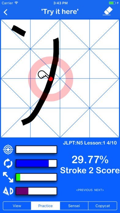 •Real-time dynamic feedback - meters are shown as you draw, that grade your performance on the angle, composition, size and shape of your drawing. You can use these meters as training wheels to guide your writing, or just as an indicator of how well you have performed.