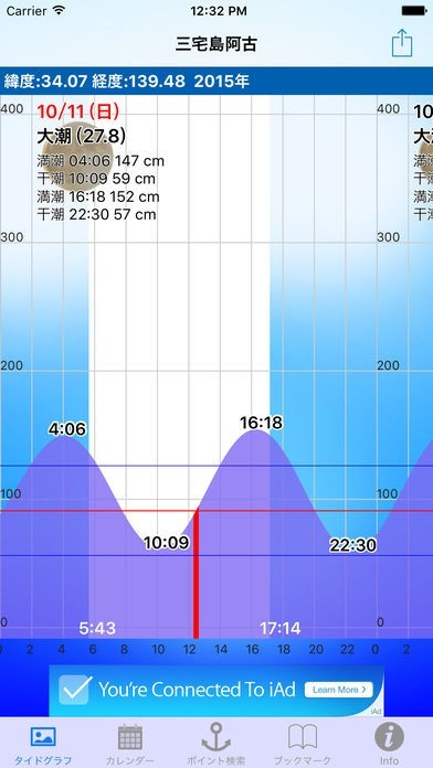 指定した地域のタイドグラフが細かく表示出来るため、釣りやレジャーを楽しみたい時に使い勝手が良かったです