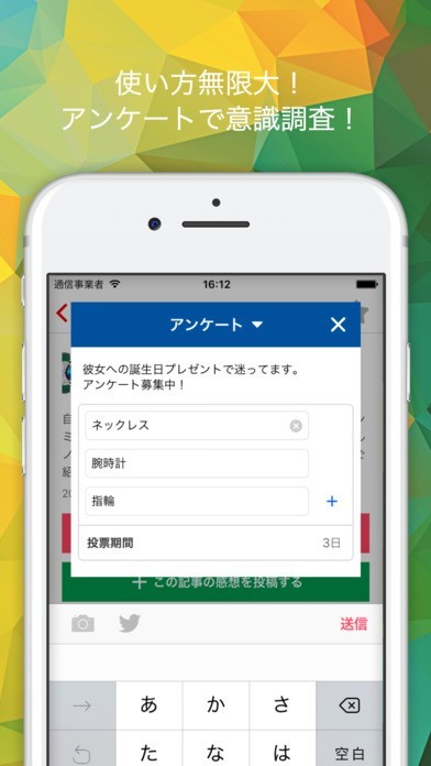 ◉ 記念日について疑問に思ったことはアンケート機能を使って統計をとることができます。プレゼントの相場は?どのサプライズがいい?など何でもOK。