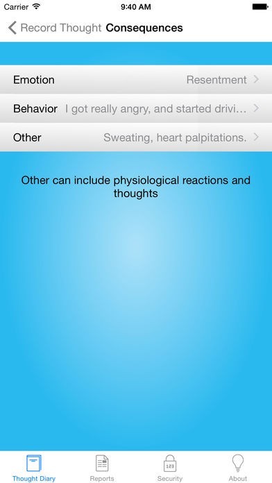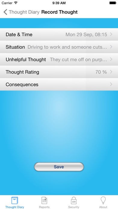 This Thought Diary is designed to be the first step in changing our thoughts by helping individuals identify the trigger situations for their negative thoughts and the emotional and behavioural consequences of experiencing these negative thoughts. It was designed by an experienced clinical psychologist and CBT therapist who believed that these tools should be available in the most accessible form for individuals to use in today’s fast technological world. It can be used by people either in therapy as a useful adjunct to the treatment, and there is a feature that allows the Thought Diary to be emailed straight to their therapist. However, it can also be used by those individuals who are embarking on a self-guided course of CBT.