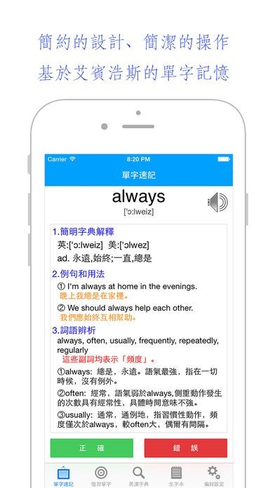 單詞速記:將單詞從不認識轉變為長期記憶。單詞會在會在10秒、30秒、2分鍾、5分鍾、30分鍾反復提醒您進行記憶。