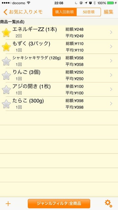 - 商品一覧(購入回数順・50音順の並び替え、商品ジャンルによるフィルタ)