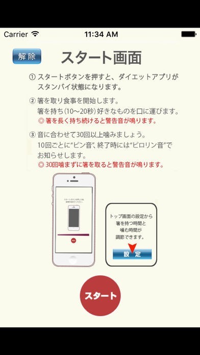 このアプリは箸置きに関する設定をしてからスタートを押して食事をするだけで利用することが出来ます。箸を持って時間内に食べ物を口へ運び、音に合わせて噛むことで箸置きダイエットが出来るのでお勧めのアプリです。