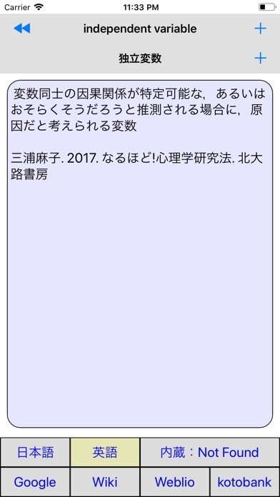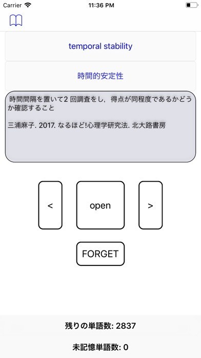 App Storeより引用心理科学の用語検索に使用してください。英語や日本語の両方から検索することが可能です。定義は記載されている用語と記載されていない用語があります。記載されていない用語の定義はGoogle検索やApple内蔵辞書を参照しやすいようにしております。学生はテストなどで出てくる単語を暗記モードを使用することができます。ADHD, ERPなどの略語の意味なども調べることもできます。