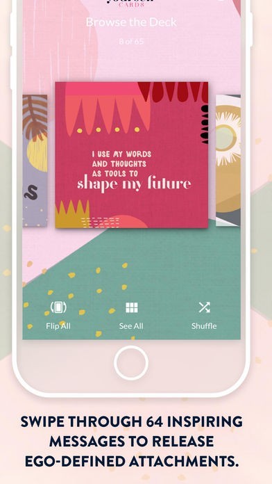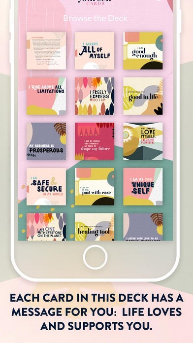 App Storeより引用Each of the 64 AFFIRMATION CARDS in this deck has a message for you: You are safe in the Universe, and all Life loves and supports you. Every thought you think is creating your future, so choose positive thoughts and words about yourself and about Life. Choose to be at peace. Choose to see clearly with the eyes of love. Come from the loving space of your heart, and know that love opens all doors.