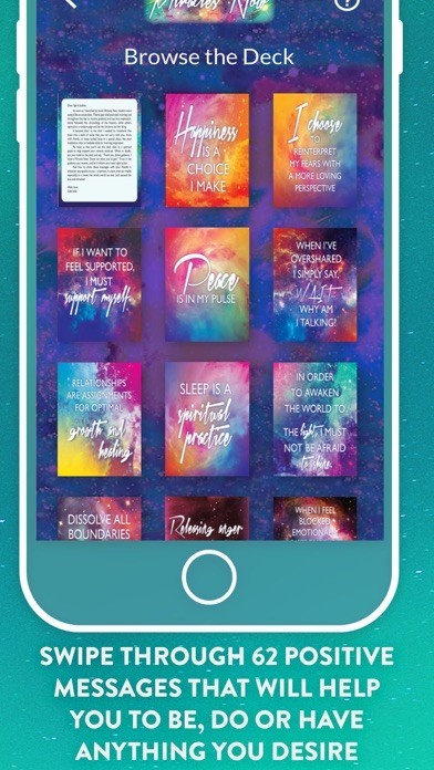 App Storeより引用This fully illustrated 62-card deck is based on Gabrielle Bernstein’s New York Times bestseller, Miracles Now. Each card contains a powerful, life-changing message, modernized and boiled down to a 140-character description. “My hope is that you’ll use this deck daily as a spiritual guide to help expand your miracle mind-set. When in doubt, put your hand on the deck and say, ‘Thank you, divine guidance. I need a Miracle Now. Show me what you’ve got!’ Trust in the guidance you receive and let it inform your next right action.” - Gabrielle Bernstein