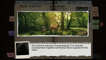 Daily events offer new dangers and situations in which you must make choices that affect the survival chances of your camp.