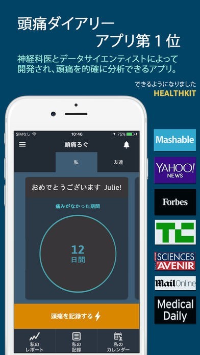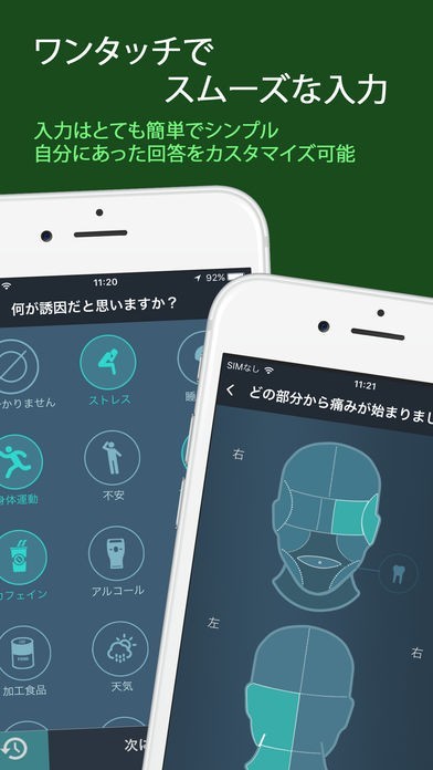 頭痛を感じた時に部位や痛みの度合いをタッチで簡単に入力できます。どのような対処が効果的だったのか、どの種類の薬が効いたのかも記録でき、かかりつけの医者と共有することが可能です。