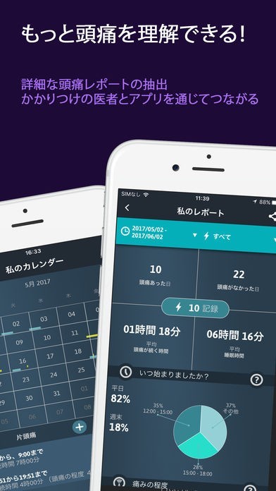 睡眠不足や飲酒など、生活習慣を毎日入力することで頭痛の原因がわかります。考えられる誘因をパーセンテージで表示できますし、いつどのような痛みに襲われたのかも一目瞭然なので、頭痛の解消に役立てることが可能です。