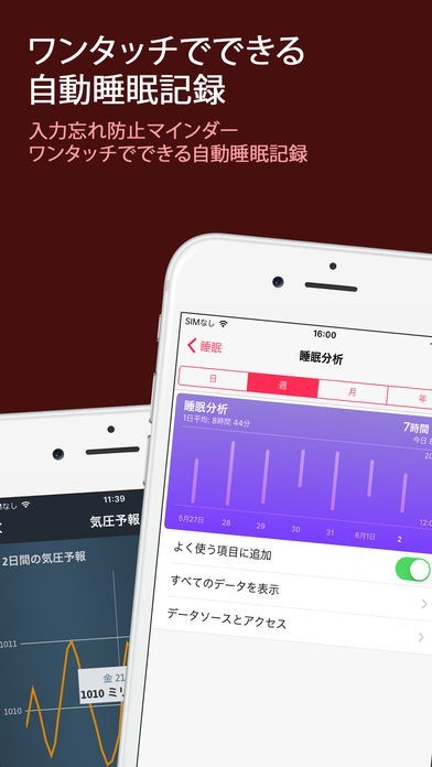 就寝前と起きた時にタッチするだけで、寝ている時間を記録できます。毎日の睡眠時間をグラフで表示でき、平均的な時間を表示することも可能ですし、マインダーで知らせてくれるので忘れる心配もありません。コツコツと記録して、頭痛と睡眠時間の関係を確かめましょう。