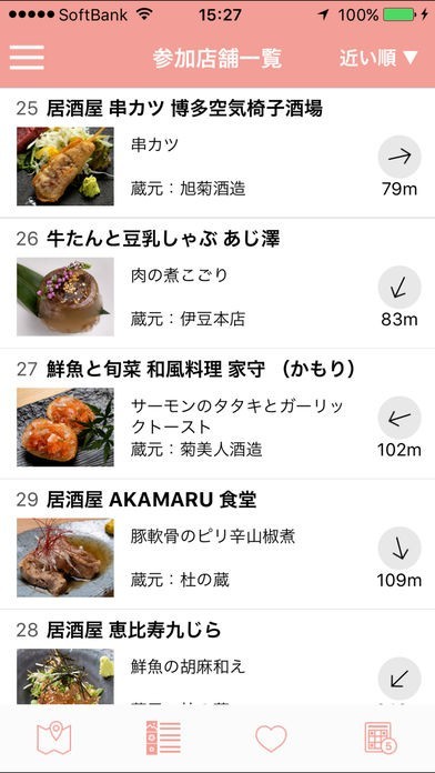 参加店舗の一覧画面では、現在地からのお店の距離を一緒に表示してくれるため、移動時間の参考になります。また、方向を矢印で表示してくれる他、近い距離順でのソートも可能です。