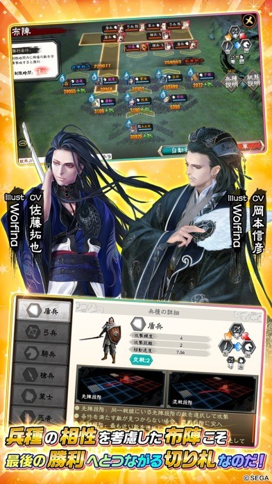 「盾兵」、「弓兵」、「騎兵」、「槍兵」、「策士」「医者」の6種類の兵種の相性関係や移動・攻撃特性、総勢150名以上の武将の「計略」(アクティブスキル)と「特技」(パッシブスキル)の特徴などを十分に把握したうえで、敵の布陣を観察し、最適な布陣編成を整えることが勝利への第一歩。