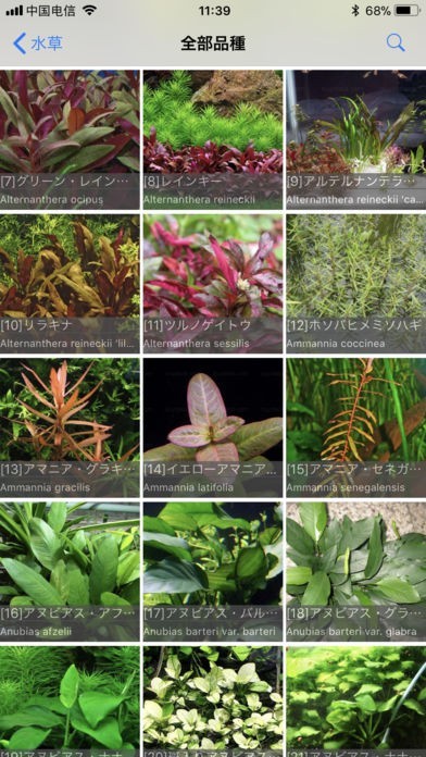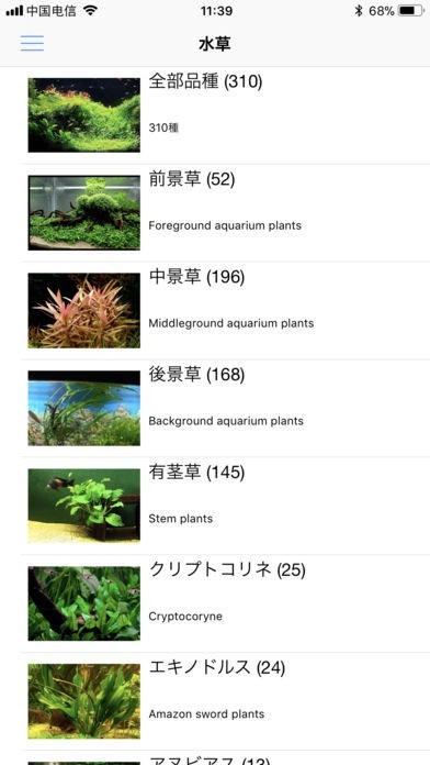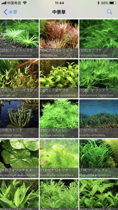 種類が豊富という点に魅力があるアプリで、前景草や後景草など10以上のカテゴリー、さらにその中から300以上が検索可能です。名称がわかれば文字検索も可能ですので、ビギナーから中級者以上まで幅広く活用できます。