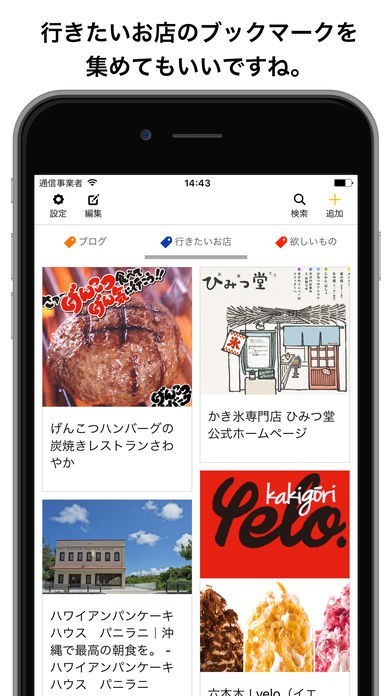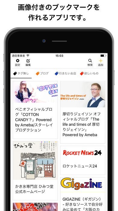 このアプリを使うことで、画像を保存していくようにブックマーク登録することが出来ます。よって、後から確認したとしても一目でどのような内容のものであるのかを確認することができます。 また、色分けしたタグ付けできることから、「ゲーム」、「スポーツ」、「行きたいお店」などというように分けることができるので、後からすぐにチェックすることが可能です。 それ以外にも、アプリ上部の検索ボックスを利用すれば、見つけ出したいものを直接的に発見することもできます。