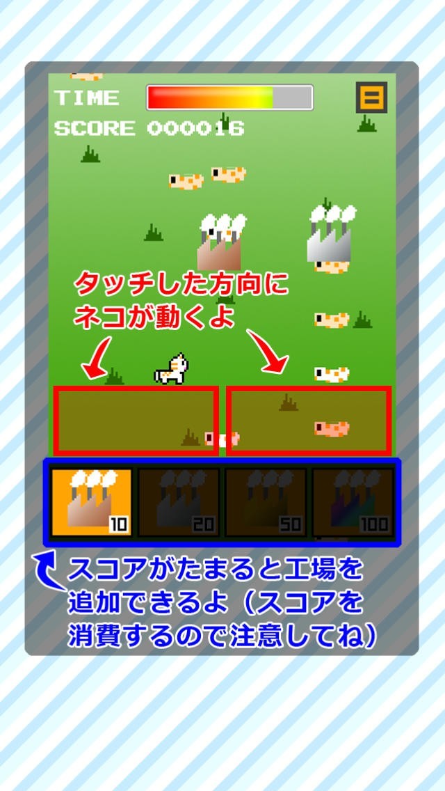 猫をタッチで左右に誘導して工場からばらまかれる無数のちくわを集める「ちくわ工場」。このゲームではタッチの時に長押しすると一度に長い距離を移動できます。長押しの時間をうまく加減してより沢山のちくわを受け止めましょう。ハイスコアを出すためのもう1つのポイントは工場の増やし方です。できるだけ違う種類の工場を作って違う飛び方をするちくわが集中して落ちてくる地点に猫を移動させて、なるべく猫を頻繁に動かさずにちくわを受け止めることができるようにすると効率よくスコアをゲットできます、1回のプレイにつき1分もかからないので、いつでも気が向いた時に1人で楽しむことができます。