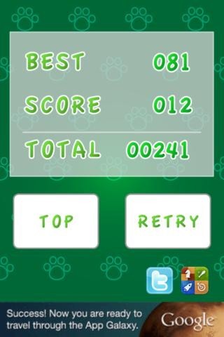 ずんぐりした白い猫ちゃんに腹筋をさせて鍛えてあげるゲームです。ゲームがスタートすると、白い猫ちゃんが現れます。猫ちゃんの下に表示されているスライダーをホールドしたまま左右に動かすことで腹筋させることができます。きちんと端から端までスライダーを動かさないとカウントされないので注意が必要です。制限時間の内に何回腹筋させられるかを競いランキング上位を目指しましょう。Game Centerと連動しているので友達と競うこともできます。