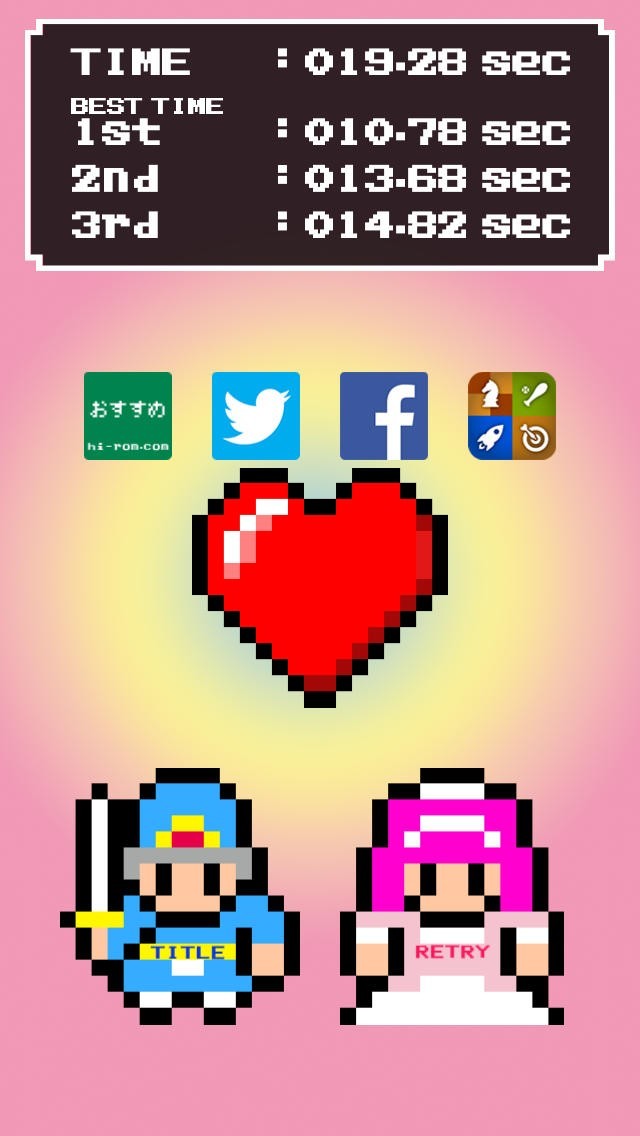 「勇者を導け!」は4つの方向ボタンのいずれかを繰り返しタップして、迷路にいるキャラクターを動かしゴールまで誘導するという単純なゲームですが、ボタンをタップするごとにボタン同士の位置が入れ替わってしまうことが特徴です。コツとしては、ゲームをスタートした後マップを見て最初にボタンを押す時に、次に押さなければいけないボタンの「絵柄」もイメージしておき、ボタンが入れ替わったらその絵柄を探してそのボタンを押す、と同時にマップを見て次に押す必要があるボタンの絵柄をイメージし、またボタンが入れ替わったらその絵柄を探し、といった感じで繰り返していくとスムーズにゲームを進めることができます。ボタンの位置は毎回変わってしまい、位置を意識しても役に立たないので、絵柄を意識するようにします。このゲームはシンプルなマップのステージが3つ用意されているだけなので、ただクリアを目指すだけであれば2、3分もあれば足りるでしょう。プレイの印象としては一風変わったモグラ叩きをしているような感覚が楽しめます。