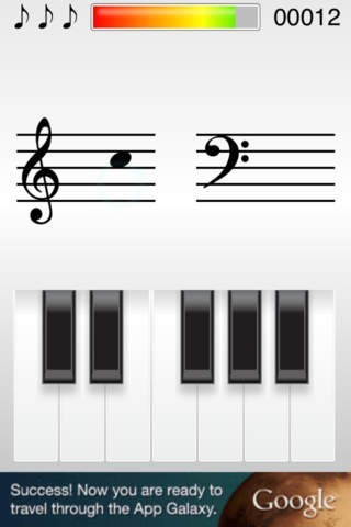 楽譜に書かれた音符が問題で、ピアノの鍵盤をタップして解答します。ト音記号とヘ音記号の五線譜それぞれに、音符が出てくるので、両方チャレンジできます。3回ミスでゲームオーバーです。得点は記録されるので、やる気が出て何回も挑戦したくなります。