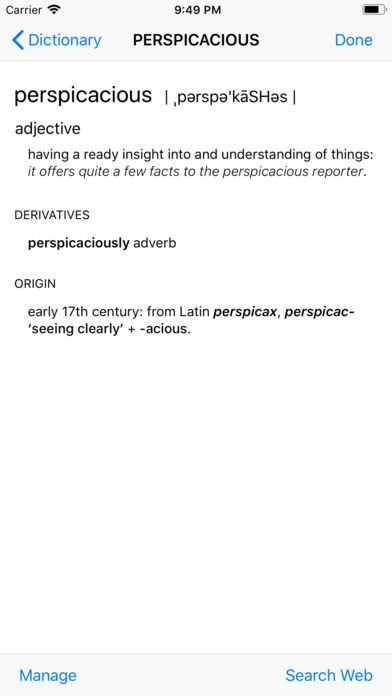 検索して表示された英単語をタップすると、詳細が表示されます。単語の意味はもちろん発音記号なども記載されているので、未知の単語の意味を調べたり知識の量を増やすなど、英語学習アプリとしても使えます。
