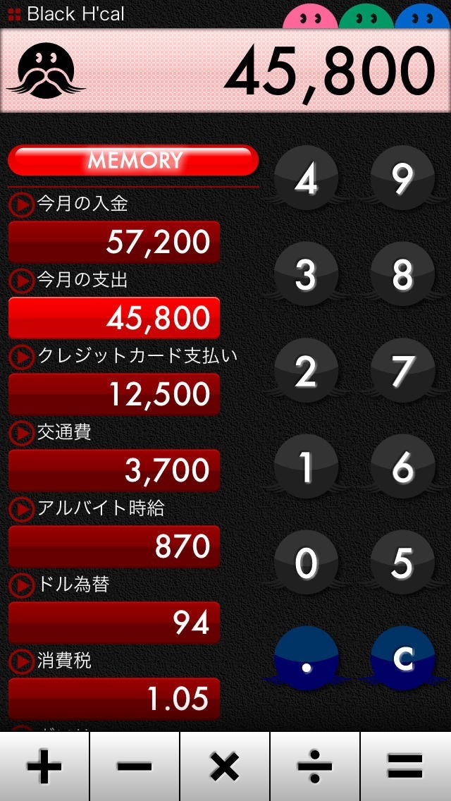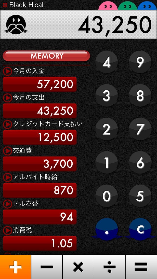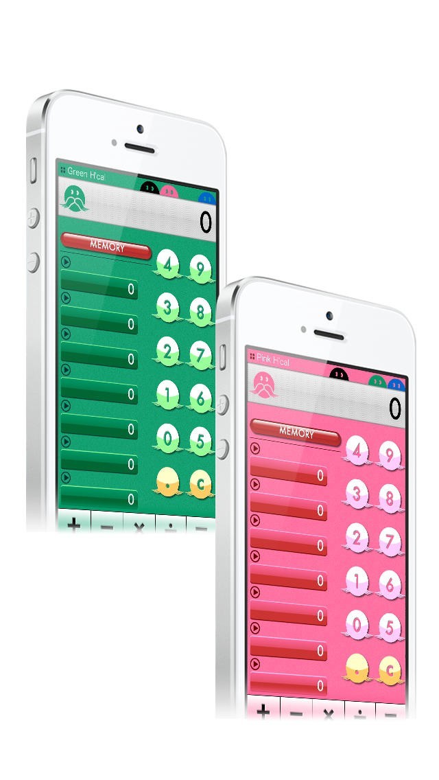 App Storeより引用H'cal×4 は、メモリーしたい数値をボタンにできる、とっても便利な計算機です。