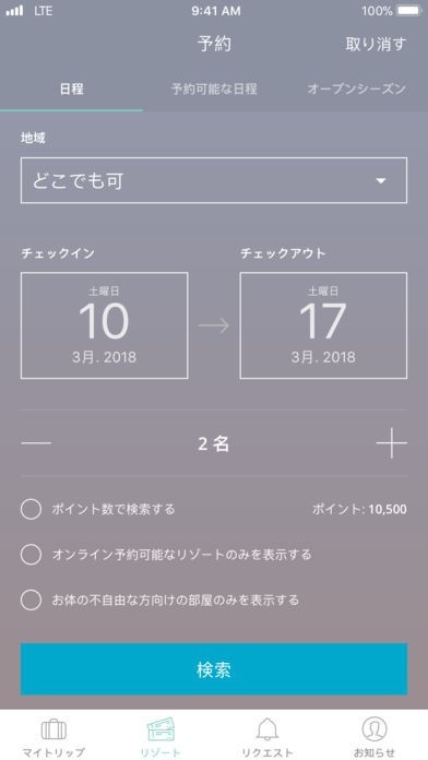 アプリを介して宿泊日数や宿泊者の数を入力して部屋を予約することができます。シーズンによって部屋ごとの料金が異なるためカレンダーからお得な時期を見つけることができます。