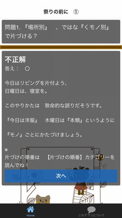 クイズに不正解でも解説が細かく表示されるので、様々な片付け方法を調べていけるようになっています。タップ操作でサクサクと問題にチャレンジ出来て隙間時間の勉強にも役立つでしょう。