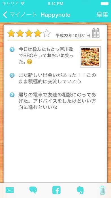 5段階の星でどのような一日だったかを評価することができます。例えば、一週間分の評価を振り返ってみて自分の人生がどのように変化しているかを掴むことのできる機能です。