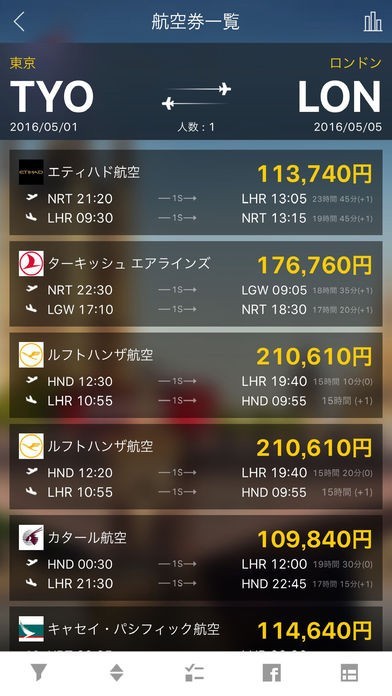 カレンダー形式で、最も安い金額で利用できる宿、飛行機などを検索することができます。グラフ形式で時間を確認できるので、家を何時ごろに出れば良いのか考えたい時に便利です。