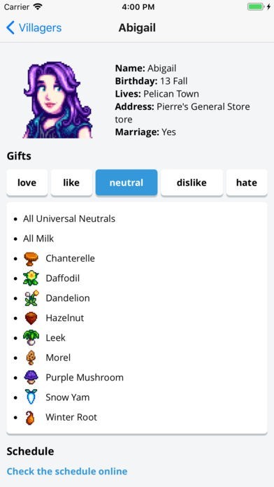 - List of Villagers, including a detailed list of all the gifts they like or hate