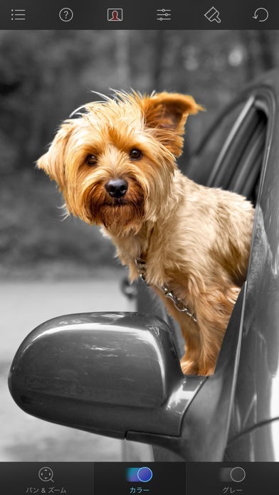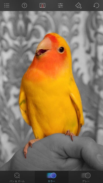 カメラロール内にある写真をモノクロ写真としてアプリ内に取り込み、カラーを出したい部分だけ指でこするだけで元の写真のカラーに戻る仕組みです。モノクロの中のワンポイントカラーが強調される素敵な写真が簡単に出来上がります。