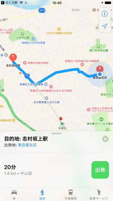現在位置から最寄り駅までの徒歩ルートが検索できる