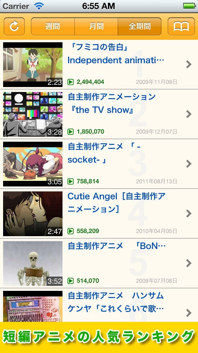 「週間」、「月間」、「全期間」に別れているランキングをそれぞれタップすることで見ることが出来ます。それらはすべて短編アニメーションであって、独自のコンテンツも多数あることから、他では見ることができないという希少性が魅力であると言えます。 また、これから人気になるような方を発掘するといった楽しさを味あわせてくれたりもします。 加えて、動画の下には動画の説明が記載されているので、気に入ったものがあればさらに詳しく見ていくのもいいかもしれません。
