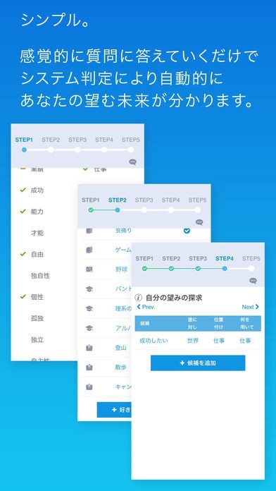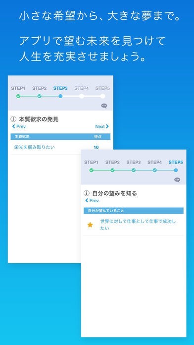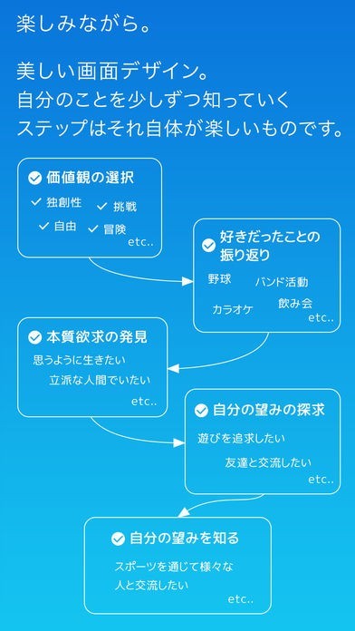 このアプリは5つの項目に記入をしていくといった内容となっています。自身が持つ価値観を記入したり、過去自分が好きだったことを振りながら最後には自分が望む未来を記入しそれを目標にして生きていくといった決心をつけるアプリとなります。