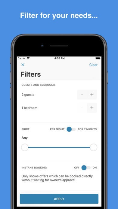 • 行先を入力して旅程を選択すれば、ワンクリックでゴージャスなバケーションレンタルやアパート、ヴィラ、高級宿泊地、ホテル、B&B、ゲストハウス、ホステル、キャンプ場などが見つかります。