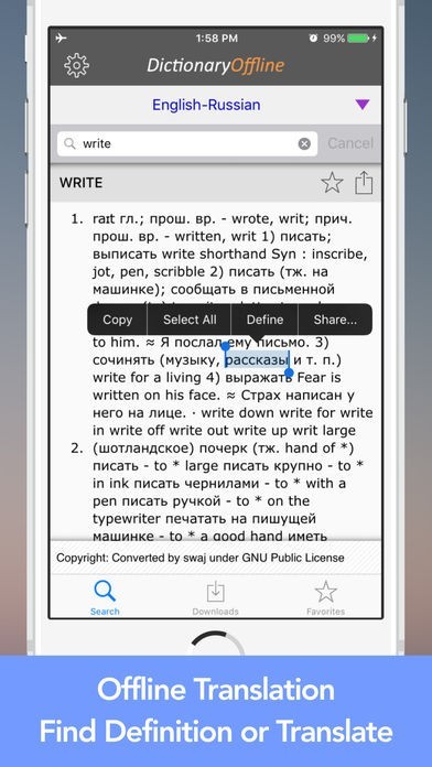 58言語の中から使いたい言語の辞書を前もってダウンロードしておくことで、インターネット不要で辞書機能を使うことができるので、飛行機の機内や海外旅行など電波状況が不安定な場所でも問題なく使えます。