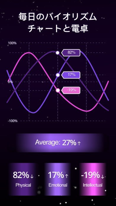 バイオリズムの変動を見て毎日の運勢を占えます。自分が今休むべきなのか進むべきなのか参考にしています。