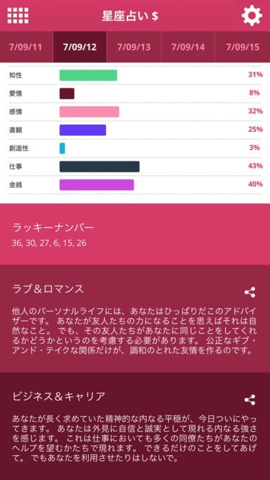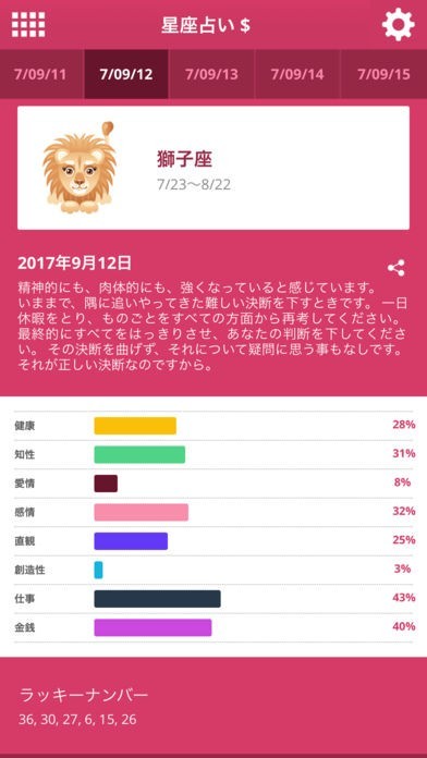 健康・知性・愛情・感情・直感・創造性・仕事・金銭の8種類の項目について見やすくて分かりやすい棒グラフとパーセンテージで表示してくれます。その日どの運勢がついているのかが一目瞭然です。