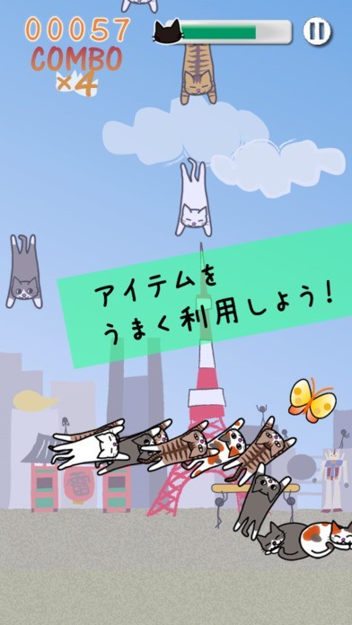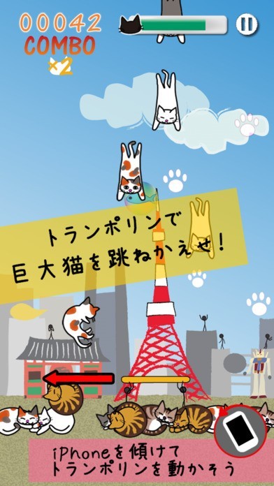 ねこぜめは、トランポリンを使って落ちてくるねこをどんどん跳ね返していきます。できなくて地上に降りたねこは、その場に寝てしまいます。かわいいねこがたくさん出てきます。見ているだけで癒されて、リラックスできます。スマホを左右に傾けながら、トランポリンを動かしていきます。背景が、東京タワー前やピラミッド前など景色も楽しめます。画面いっぱいにねこがたまると、ゲームオーバーです。 またたびなどねこが好む4種類のアイテムがあります。ゲットすると、アイテムによって様々な効果が起こります。時間稼ぎができ、長く遊べるようになるのでアイテムはゲットするのがポイントです。暇つぶしになり、夢中になれます。